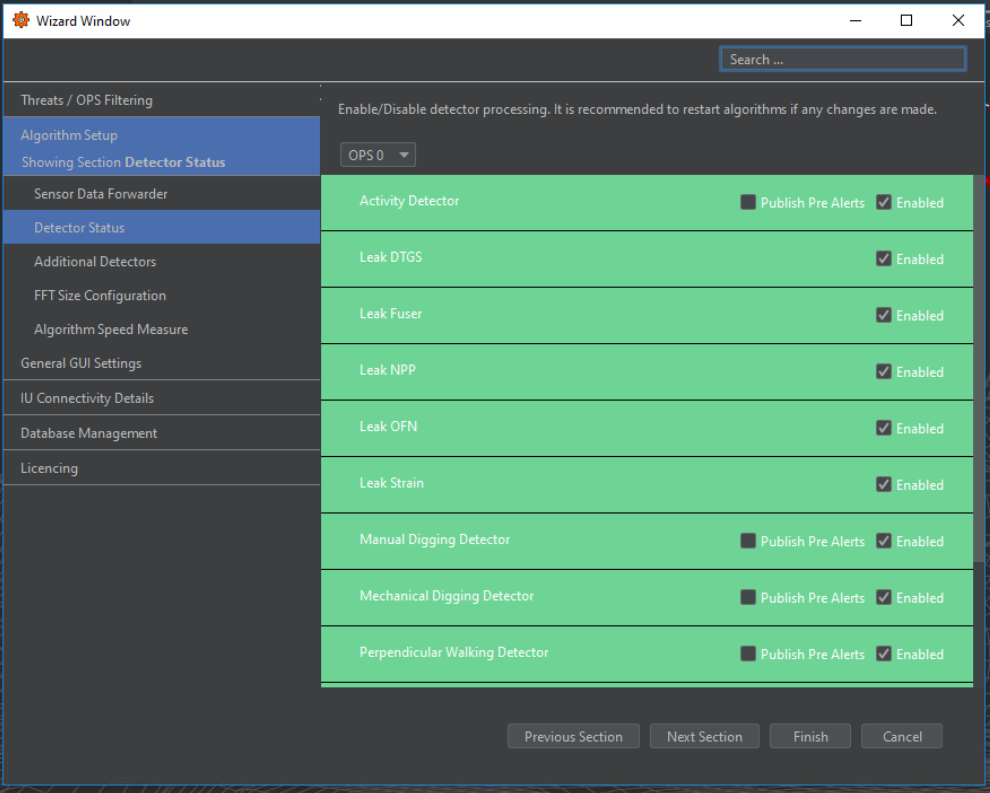 Checkboxes are provided to enable/disable detectors for each OPS and to enable/disable the publishing of pre-alerts for relevant detectors. The status of detectors for each OPS can be viewed within the Detector Status tab (Figure 8), as shown in the OPS drop-down list.