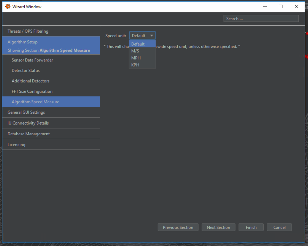 The speed units utilised within the software can be modified to a client’s preference within the drop-box on the Algorithm Speed Measure tab (Figure 12). Anywhere speed is displayed within the software, it will use the specified units.