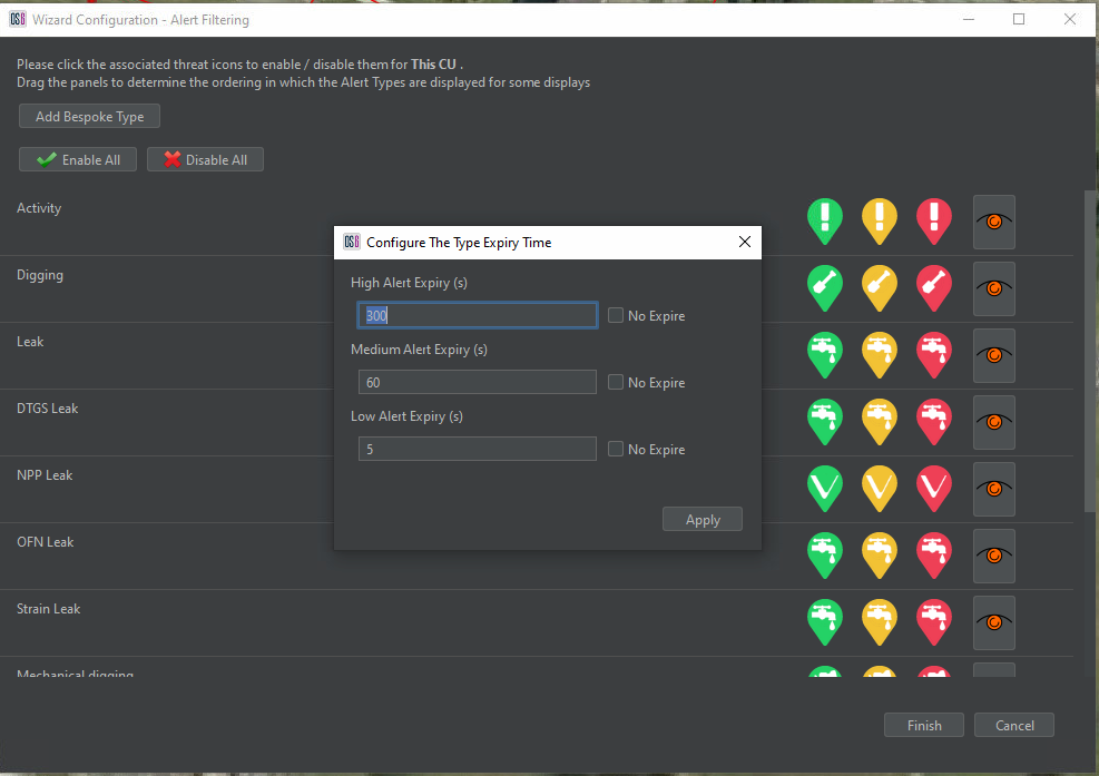 Within Alert Filtering, it is also possible to configure the threat expiry time for each alert type. Select the icon to the right of the high alert icon for each alert to do so. This opens the configure alert expiry time window (Figure 4). From here, times can be altered from defaults and set to permanently display the icon on the map interface (until the alert is acknowledged or dismissed).