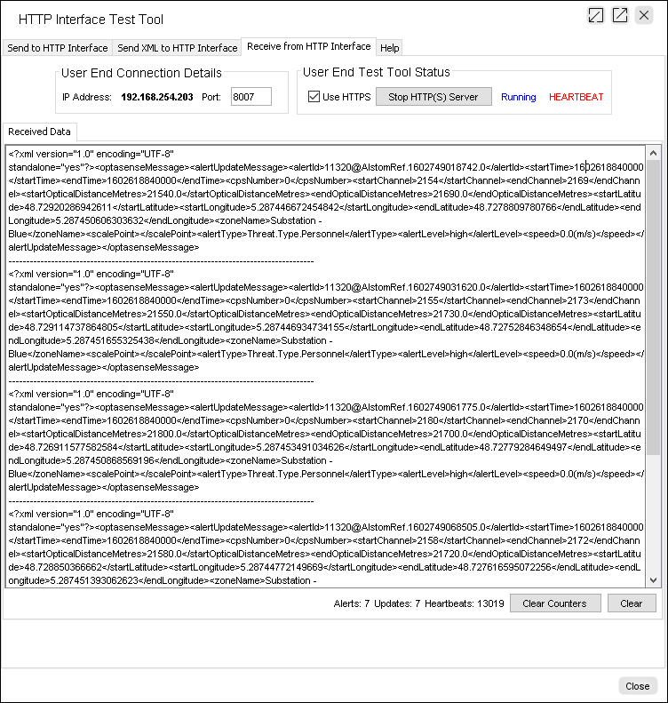 With the Test Tool fully configured, by clicking ‘start’ in the Modbus Alert tab will launch the tool. If successfully configured, OptaSense system alerts will now start to appear in the Modbus Alerts tote. Verification of the test can be done by acknowledging an alert in the tool and comparing with the OptaSense system that this alert has been acknowledged.