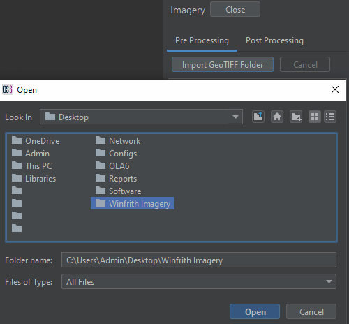 On the right-hand side of the Imagery window, select Import GeoTIFF Folder and navigate to the required folder. Select OK to process the imagery. Once finished, the window will say Processing Complete.