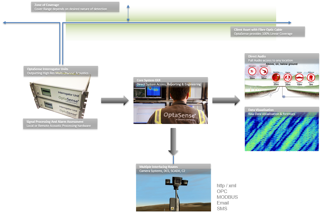 OptaSense® is a sophisticated fibre optic-based system that allows Users to monitor acoustic activity at any point along a deployment of fibre optic cable. This acoustic surveillance capability is partnered with sophisticated acoustic analysis software which provides event alerts to the end user. These alerts provide a powerful, automated means of monitoring linear assets such as perimeters, borders and pipelines, alerting the user to the presence of unauthorised activity taking place.
