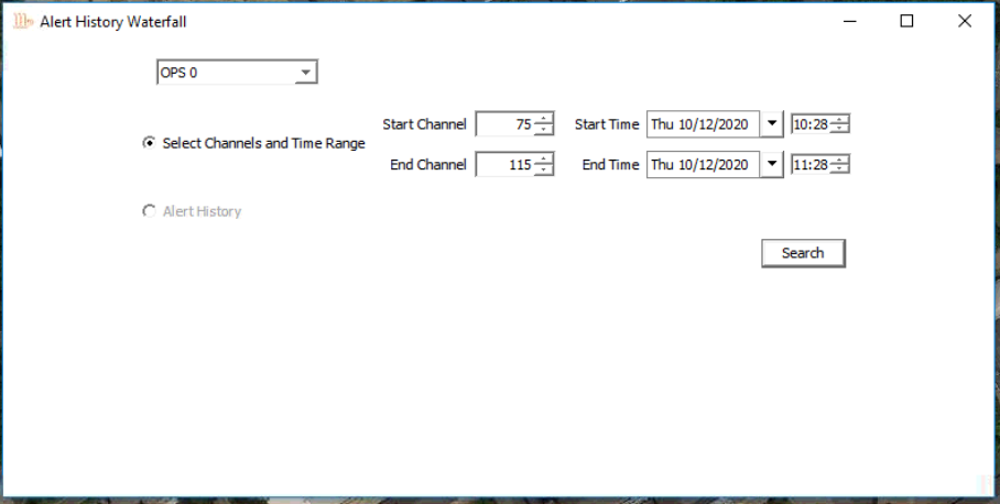 Select the required time and channel range then click “Search” and wait for the resultant waterfall image to load. The Historic Waterfall Data will display the selected time and channel range as a waterfall in a new window (Figure 112).