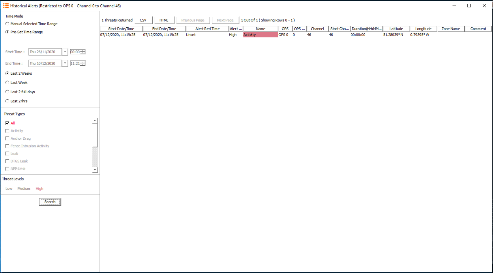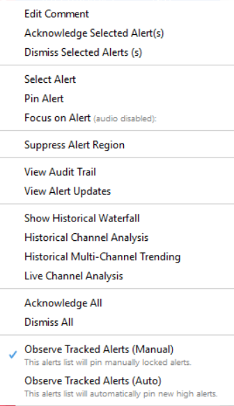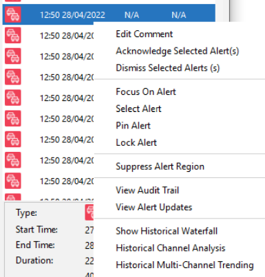 The Alert History Waterfall can be accessed from various areas of the system. Most notably through use of the right click functions on both the map section of the map display and through alert lists. It can also be accessed via the menu option Historical Analysis.