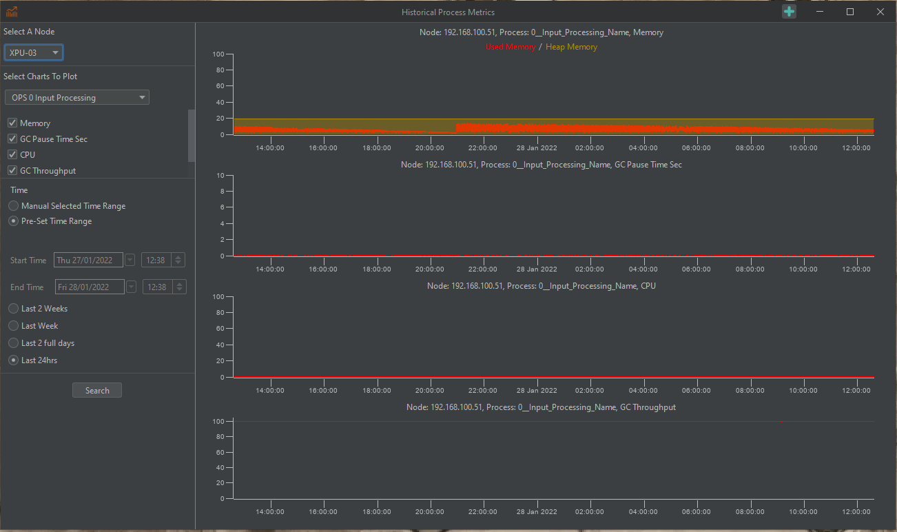 From the toolbar on the left the user must select the required node, monitoring period and what processed are to be displayed as plotted charts. It’s advised that continuing spikes, dips or absent periods be investigated.