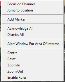 | Mouse Mode | Channel Zoom – As with the full waterfall this allows the user to zoom in to sections of the waterfall Audio – Allows the user to draw a path over an event of interest and recall the audio Historical Analysis Channel – Allows the user to draw a path over a channel of interest and open an analysis window. Export Channel to WAV File – Allows to export file Measure Speed – enables the user to measure the speed of an event, in kph, mph or m/s |