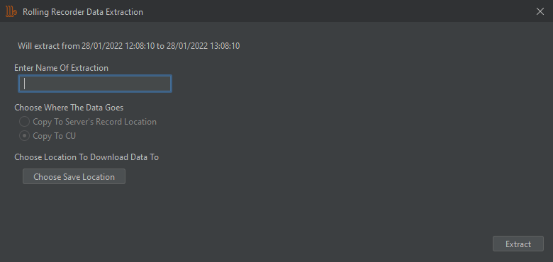 The user should enter a filename relevant to the data being extracted. Sensor Data can be extracted to the server’s record location (typically disk4) or directly to the CU. Histogram Data can only be extracted directly to the CU (an appropriate location should be selected).