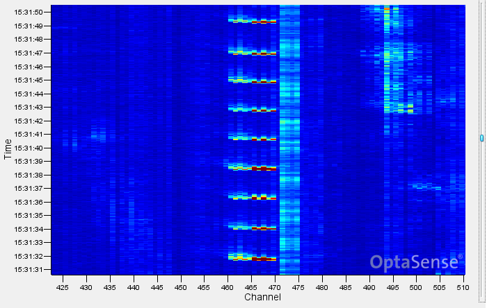| Manual digging comprises a series of short, sharp blows to the ground (Figure 114). In OptaSense, these transient signals display as narrow bands of energy in the Y axis (time) but possibly broad in the X axis (distance / channel spread). Digging methods vary, however the signal will likely repeat – usually every few seconds – with regular breaks, changes in frequency, and duration, but generally over a prolonged period we are looking for a series of individual impacts centred on a specific channel. A farmer may make impacts but will move around – the malignant digger will be centred on a specific location. With digging times to get down a metre somewhere between 20 minutes and a couple of hours the concerted effort of manual digging is very clearly distinguished from benign background activity. The detector can also incorporate positive or negative filters against cattle movement or very periodic activity (e.g., pumps, water dripping, etc.) which are known to create nuisance alert states. | Figure 114: An example of Manual Digging on the Waterfall. |