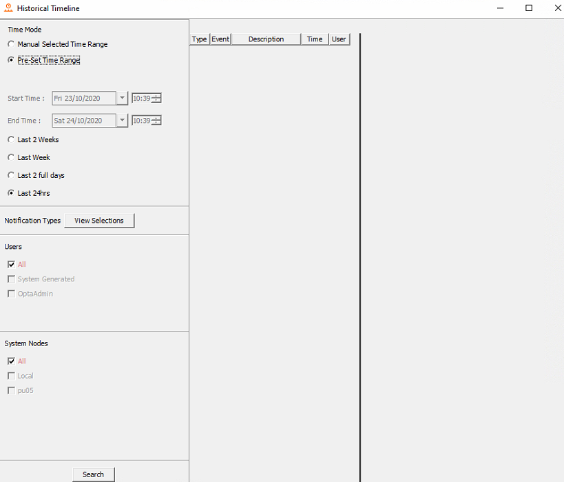 The dialog box shown will appear where the desired OPS, date/time and channel range can be specified. The data source can also be changed to retrieve data from other rolling recorders. The search function is limited to a 24 hours period.