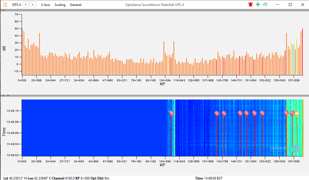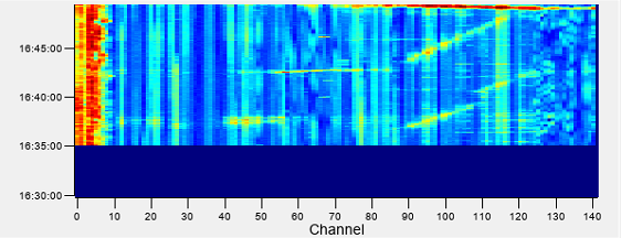 The surveillance waterfall enables users to view live acoustic sensor data in graphical format. Activities, as they occur, can be observed through the display, and tools can be used to analyse their source in better detail. To access the waterfall, from the toolbar, select Live Analysis and then Waterfall.