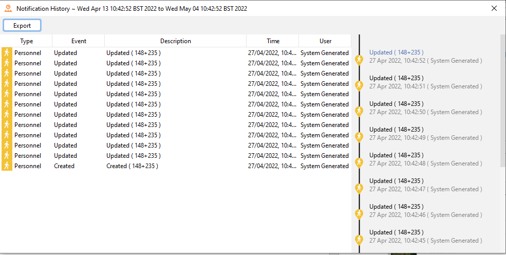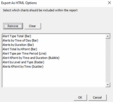 Historical alerts can be displayed. These alerts can then be exported into a chart or CSV format. To access this feature, from the toolbar, select Historical Analysis and then Historical Alerts.