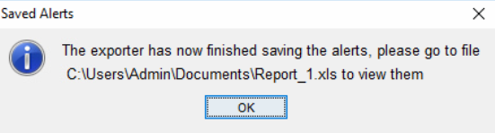 The button will export alert data into Microsoft (MS.) Excel file format. Once the button is clicked, a prompt will ask you to confirm the export; select yes. Choose the desired location and click save. Another prompt will appear confirming that the export has finished.
