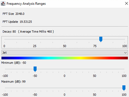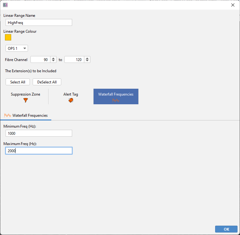 Another feature of the waterfall display window is the ability to display specific frequency bands. Note that this frequency band selection does not affect the frequencies utilised within the detectors, nor will it modify the sensitivity of the system. This will, however, modify the histogram data when viewed on the waterfall in addition to any subsequent histogram rolling recorder files.