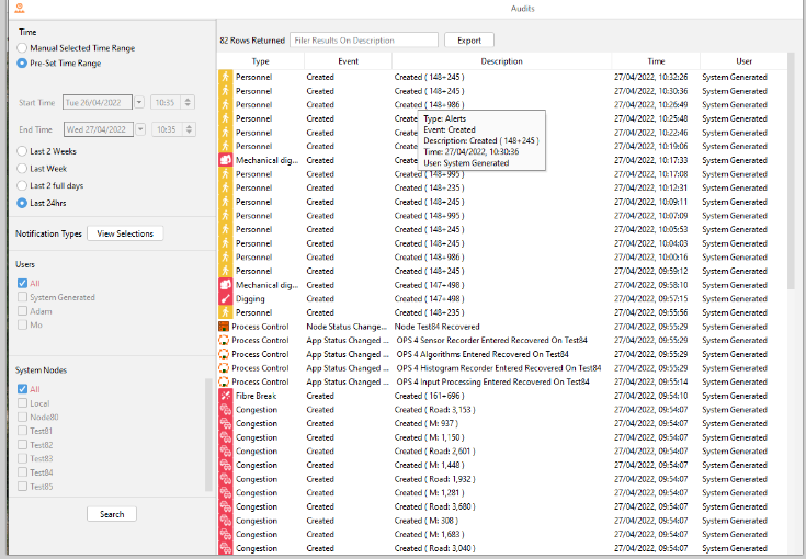 From the toolbar on the left side, the user can select the duration they require to run the report on. The user can also select the level of alert (low, medium or high), a specific alert type and span the search over multiple OPS. Once this form is filled out, users can either extract the results to CSV/HTML or display the results on the right-hand pane showing all information stored about the occurrences, e.g. start and end channel, type (personnel, vehicle etc.), latitude and longitude and comments entered by the user. This right-hand pane uses a 'Page' mechanism in that users can page through 10000 alerts at a time.