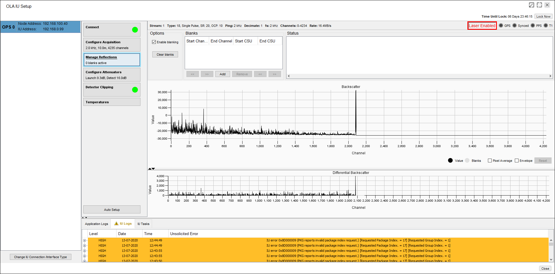 Once checked, the IU data stream will drop out for several seconds whilst the fibre assurance stream is set up. After this point, the processing will automatically generate an alert should a loss of signal be detected anywhere along the fibre route. Once a fibre break has been detected the fibre assurance stream will need to be re-enabled once remedial works have taken place.